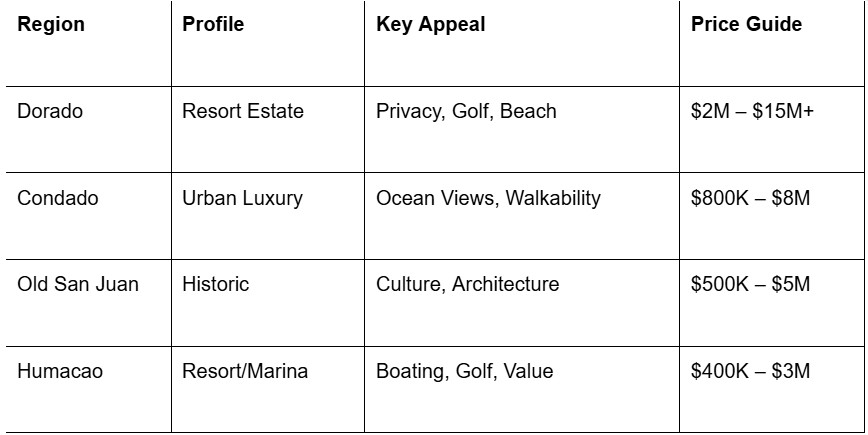 Selecting the right location drives both lifestyle satisfaction and investment performance in Puerto Rico. The luxury market is distinctly segmented between private resort-style enclaves and high-energy urban districts, each offering unique benefits for primary residents and investors.
