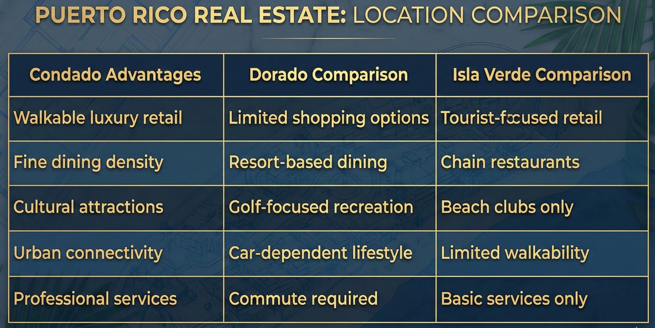 Ashford Avenue properties consistently trade at 15-20% premiums compared to similar oceanfront units in other San Juan neighborhoods. The walkability factor cannot be overstated—residents can access luxury retail, gourmet restaurants, private banking, and premium healthcare without requiring a vehicle.