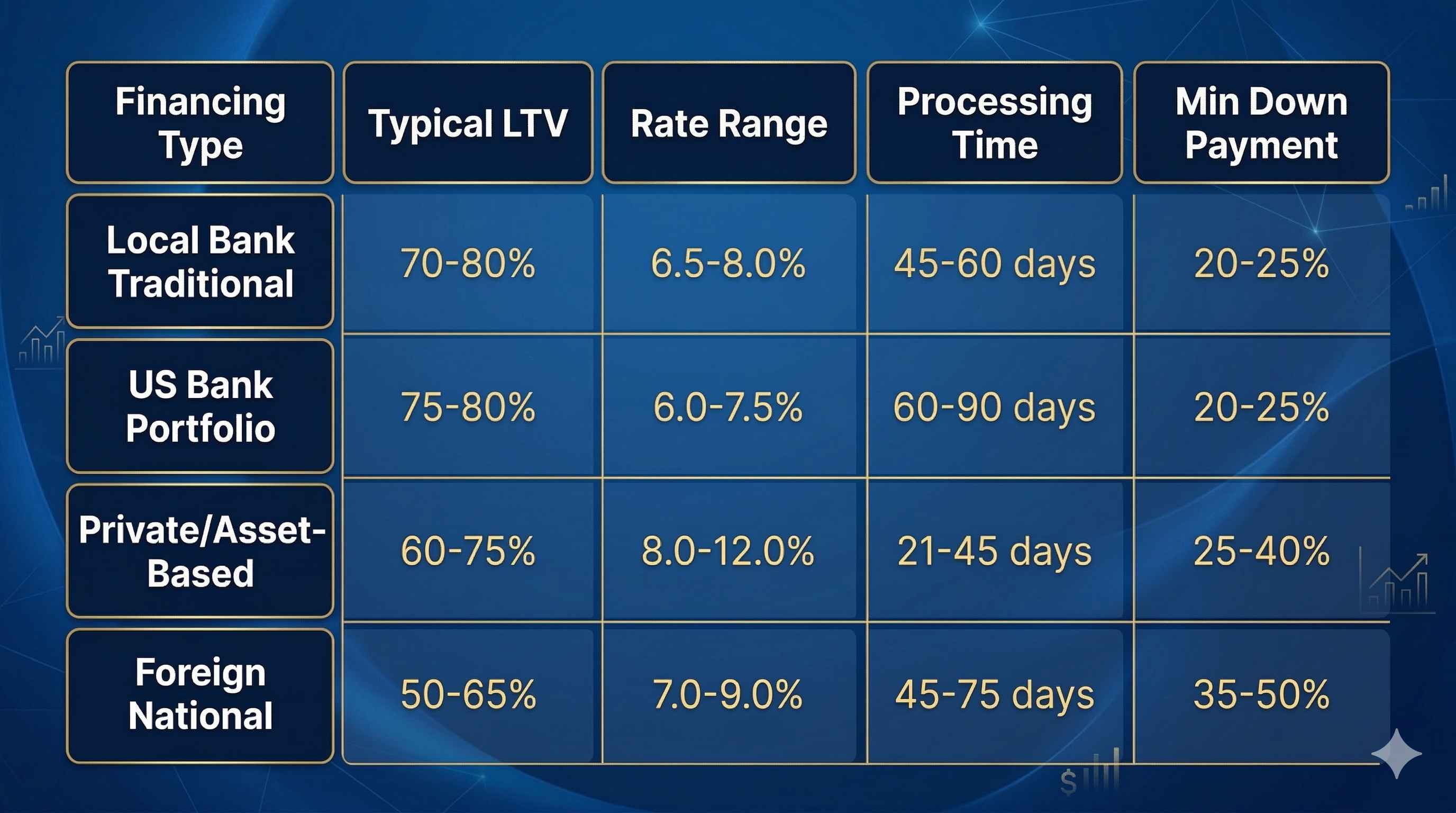 Asset-based lenders focus on property value and borrower net worth rather than traditional income verification. These loans typically offer loan-to-value ratios of 60-75% with interest rates 2-4% above traditional mortgages. The approval process can complete within 30 days, making asset-based lending attractive for competitive luxury property purchases.