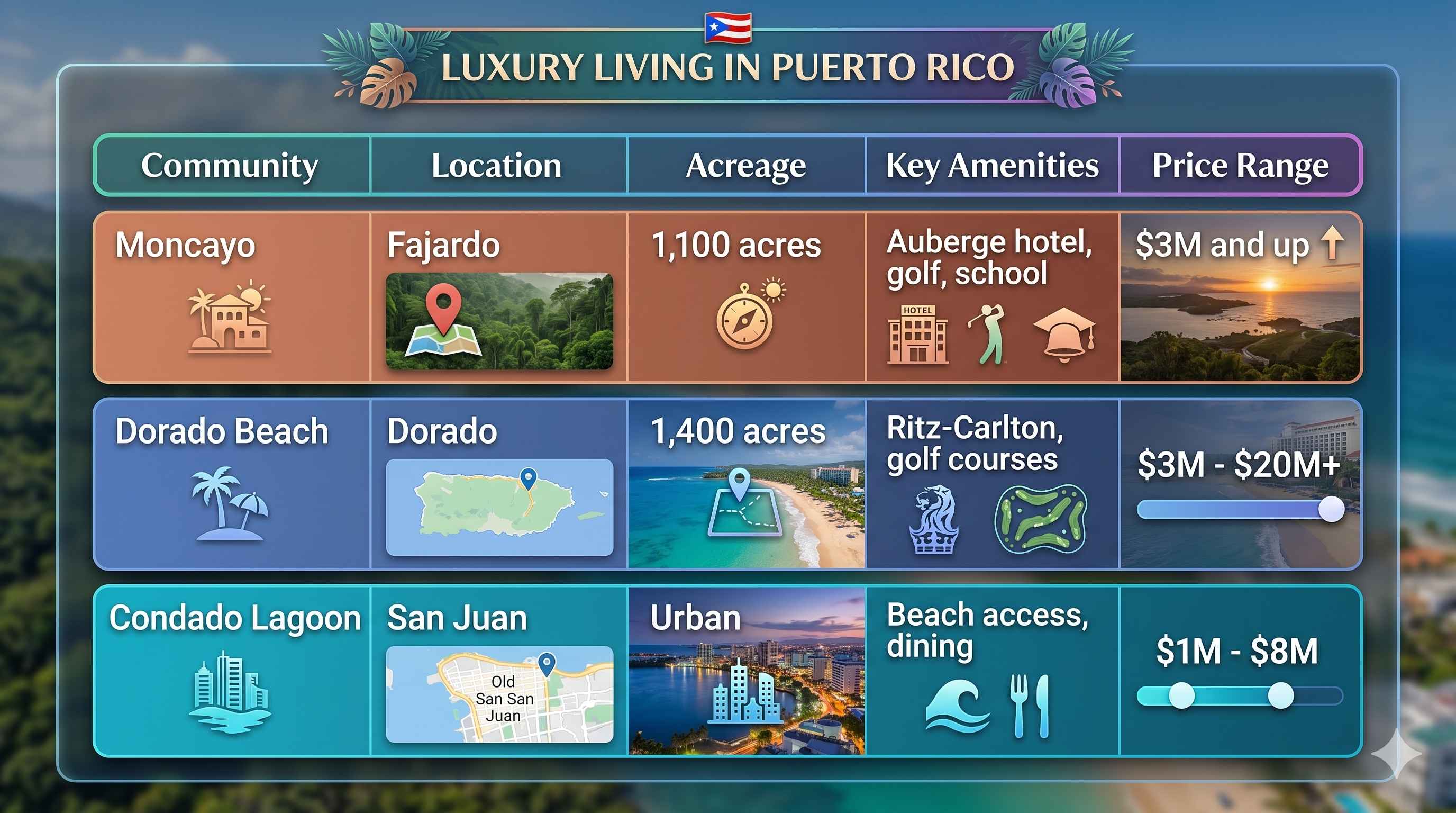 Moncayo competes directly with established luxury communities in Dorado and Condado while offering unique advantages through its eastern location and comprehensive amenity package. The 1,100-acre scale exceeds most Puerto Rico luxury developments, providing greater privacy and exclusivity for residents. Auberge branding distinguishes Moncayo from unbranded luxury developments through proven hospitality management expertise.