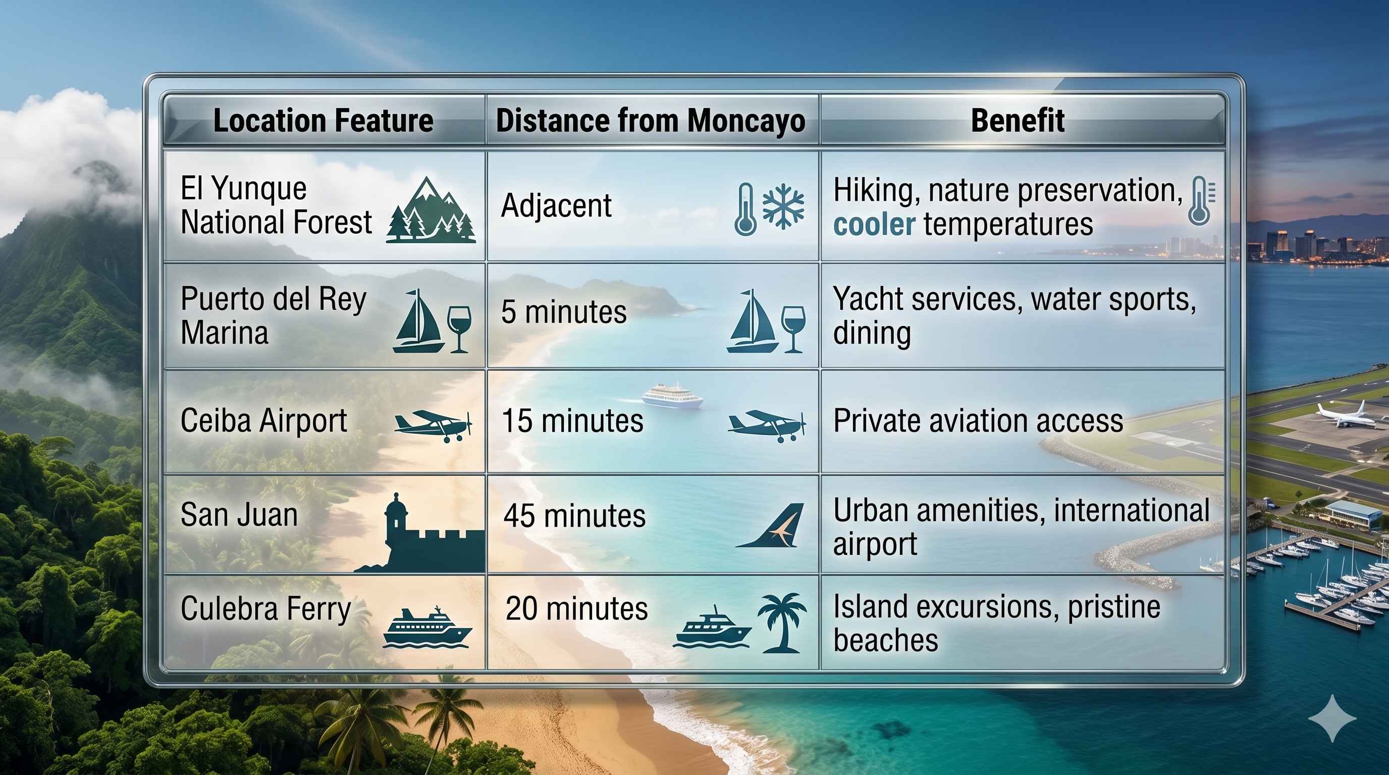 The strategic location between El Yunque National Forest and Puerto del Rey Marina creates unparalleled access to both natural preservation areas and world-class marina facilities. El Yunque luxury homes typically command premium pricing due to proximity to the rainforest, and Moncayo capitalizes on this geographic advantage. Puerto del Rey Marina properties benefit from direct access to one of the Caribbean's largest marinas, supporting yacht ownership and water sports activities.