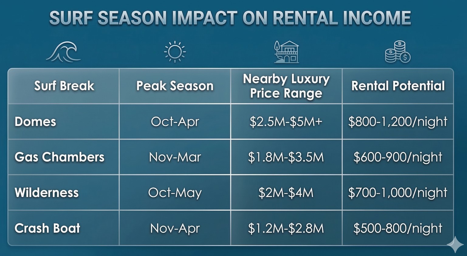 Luxury developments increasingly incorporate surf-specific features like board storage, outdoor showers, and beach gear facilities. High-end vacation rental properties market directly to surf travelers, generating strong rental yields during peak surf seasons from October through April.