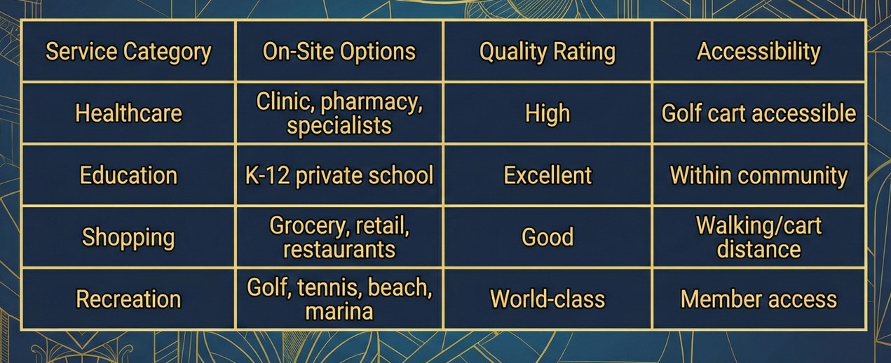- Lifestyle value is driven by internal mobility (golf carts), services like schooling and healthcare access, and East Coast positioning for island-hopping and airport connectivity.